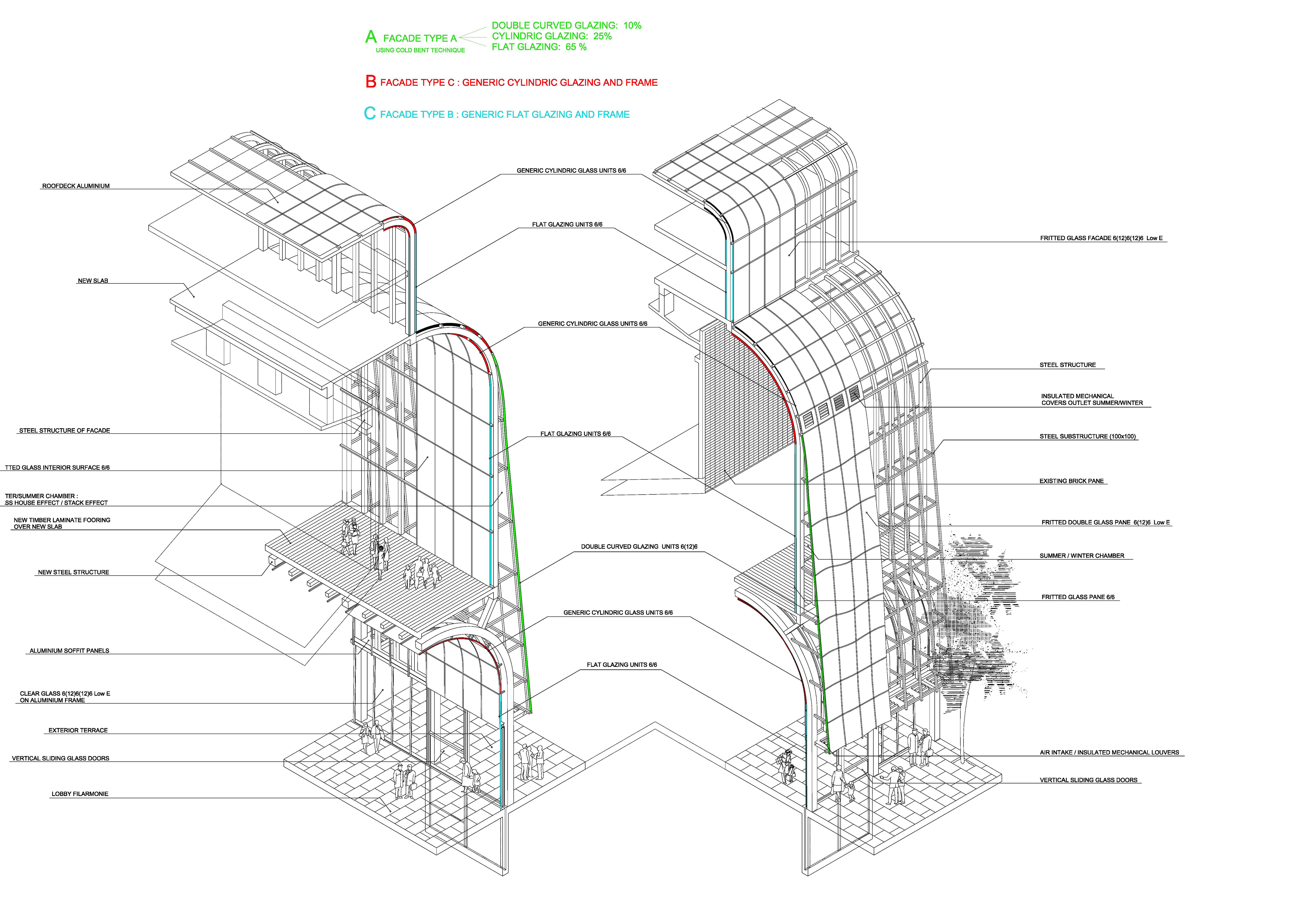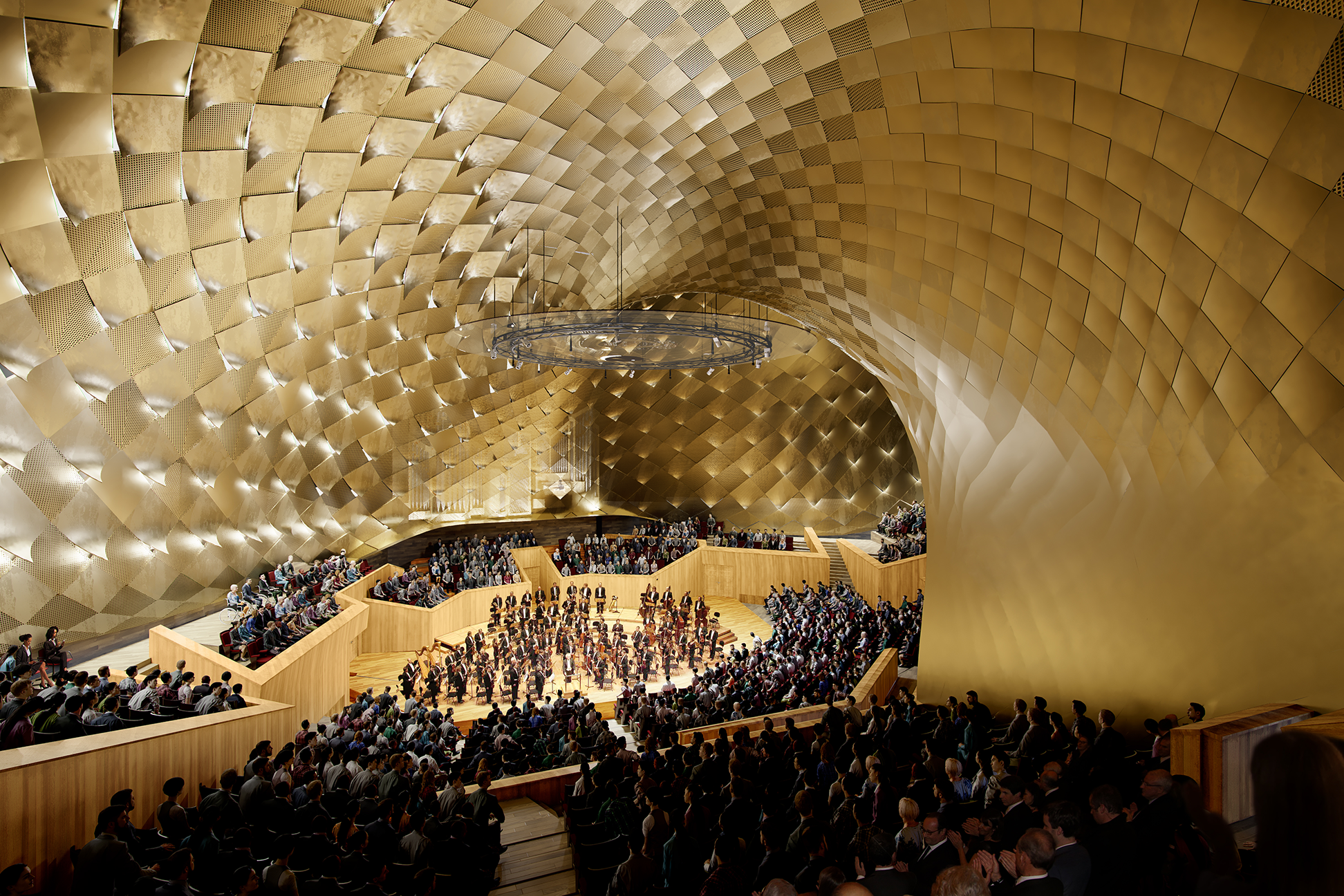 Our proposal for this large cultural insitution has been to reconnect the Gasteig with the city of Munich. This has been achieved in several ways. Functionally, by attempting to bring life to the western part of Rosenheimer Strasse, open to the street, and creating a great terrace that will attract the people to visit it and stay. Visually, this terrace is open to the river, to the view over Munich and to the Alps on a clear day. By opening up and clearing this area from interruptions, this terrace, also open and connected to the great lobby and foyer, will be full of activity. The existing Hall has poor acoustics: arriving at this innovative solution has involved a highly collaborative design process between Architect and Acoustician. In our opinion, this collaboration is essential when designing an innovative concert hall that doesn’t involve the traditional rectangular ‘shoebox’ shape. The first modification to the main room involves transforming one fan shape room into two rectangular shoeboxes. This involves extending the central ‘side walls’ to form a ‘v’ or ‘ships bow’ in the centre of the room.
