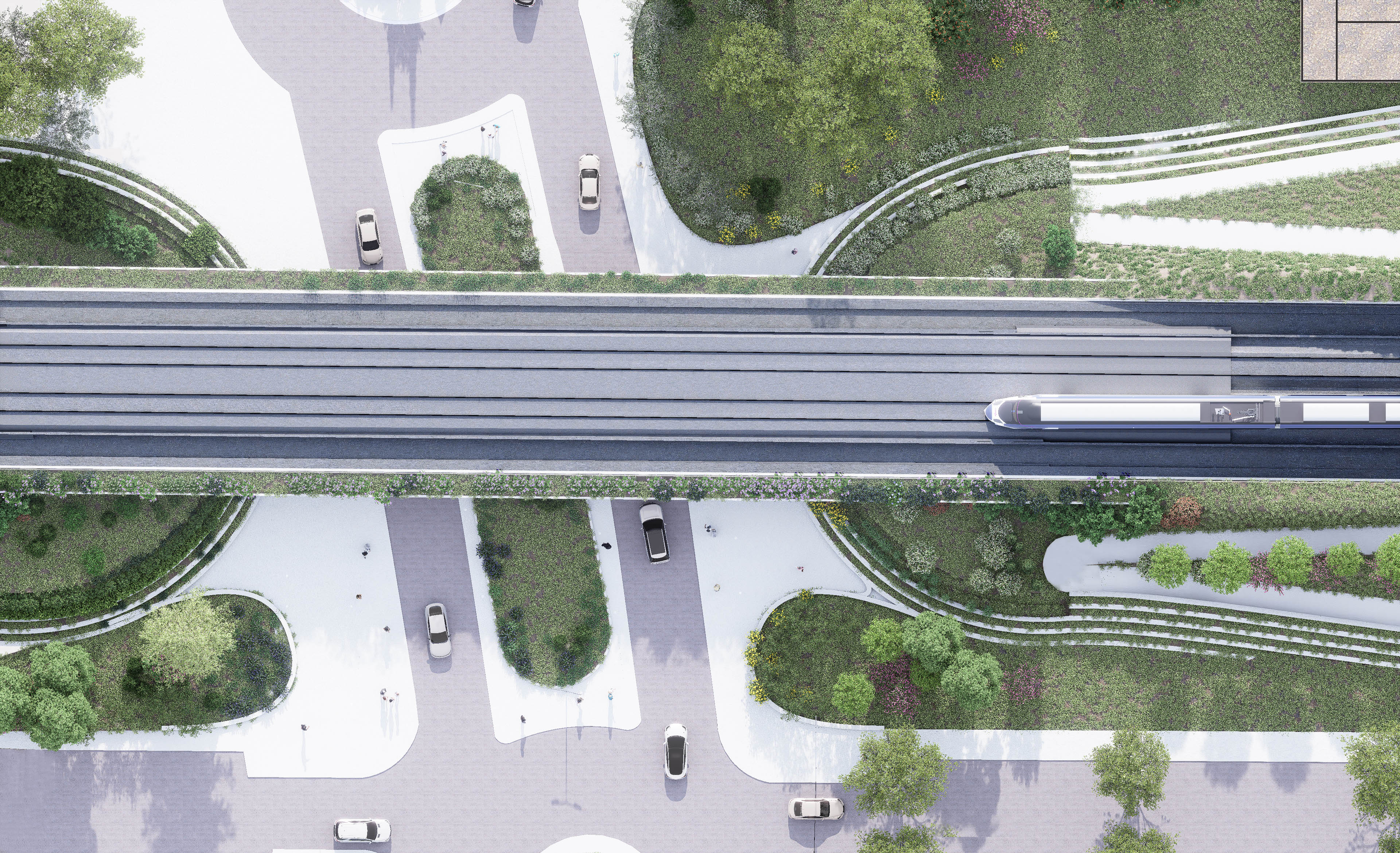 The project has a unique approach to the trend of redevelopment of rail lines within cities. Using underpasses and wide overpasses, the aim is to improve upon the curren solution and redifine the interaction with and across the railway. There is an extensive aspect of urban development, with multiple points of intervention along the railway.