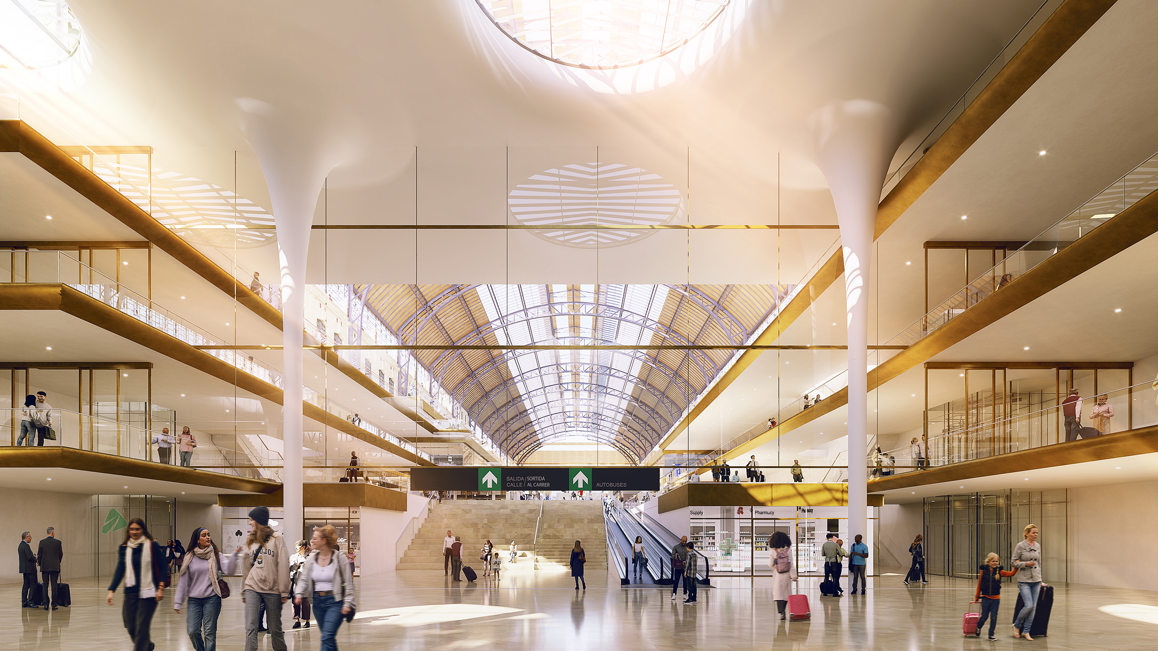 The main access to the station itself is from this historic building of the North station, with auxiliary accesses along the whole intervention. All access points lead to the same vibrant space underground, a commercial area, three stories high that leads into the exchange transport hub. The underground space turns its constructive elements, such as the pillars, skylights, floors and partitions into true protagonists of a sober, poetic and rational design.